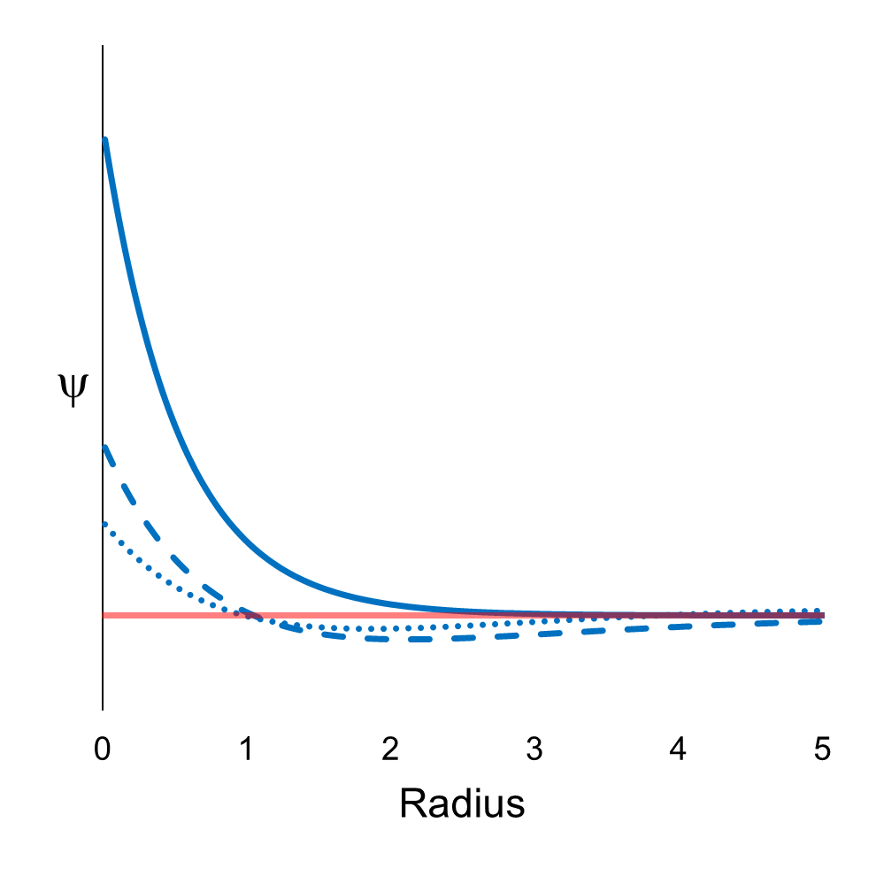 line) is zero for all three. (Note that these eigenfunctions are for electrons with zero angular momentum.