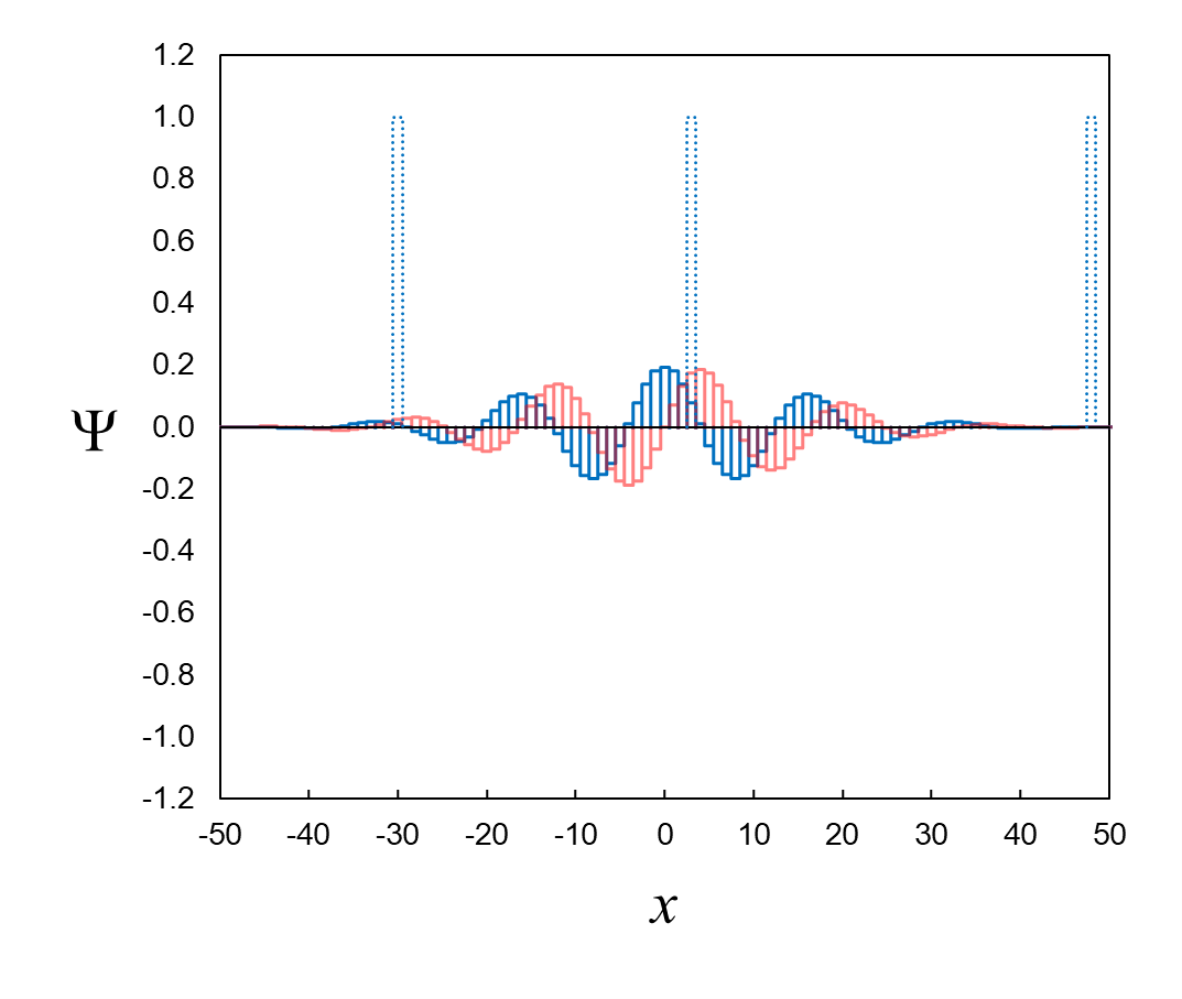 Figure 7, top, shows a set of neighboring definite-position eigenfunctions (light blue lines). There are 101 of them ranging from