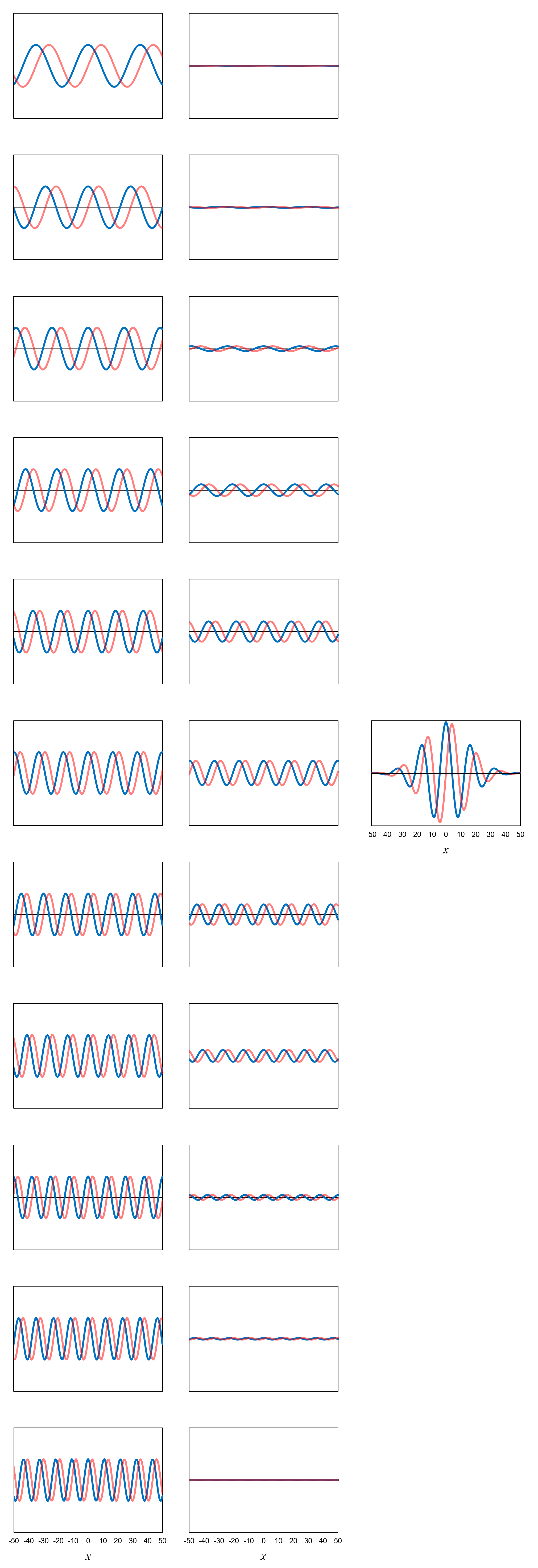 Figure 10, left column, shows a set of eleven definite-momentum eigenfunctions for momentum values ranging from 1.9 (top) to 6.1 (bottom).