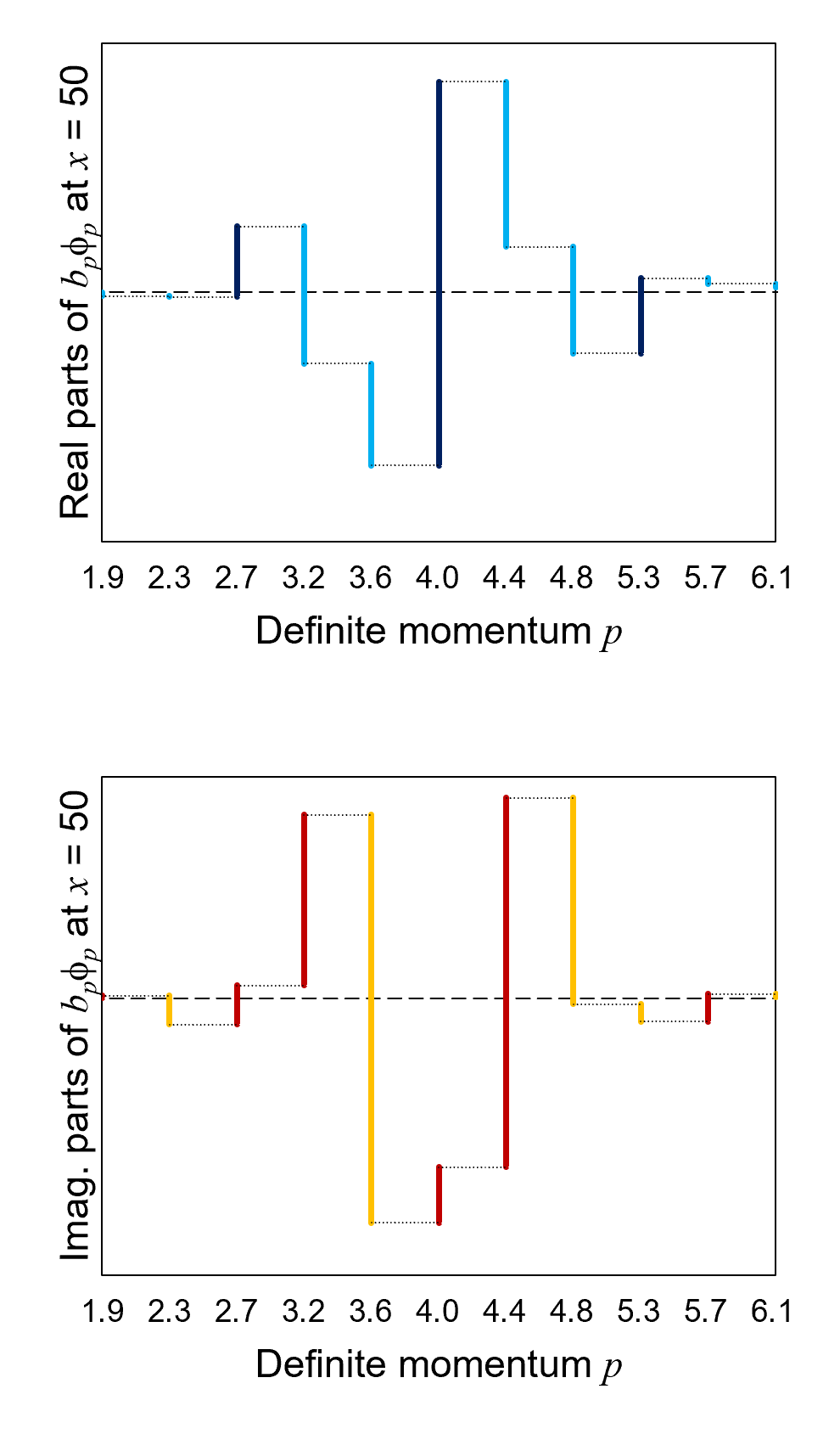 As we did for position, we are limiting momentum to discrete values (even though momentum is actually a continuous variable). The increment between the discrete values is 0.42 (which, by the