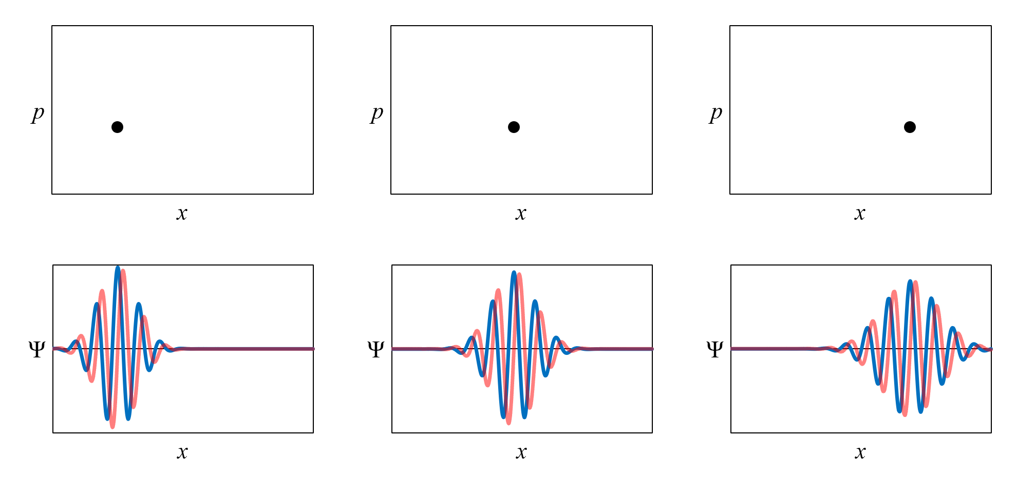 The graphs on the bottom of Figure 3 show the quantum-state representation at the same three times. In the quantum-state representation, the electron is represented by a wavefunction Ψ. The wavefunctions shown are realistic snap-shot-in-time representations of an electron moving from left to right with no force acting on it.